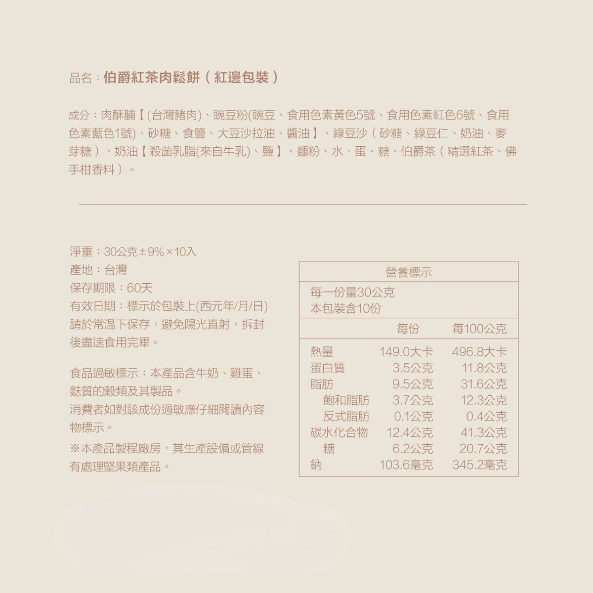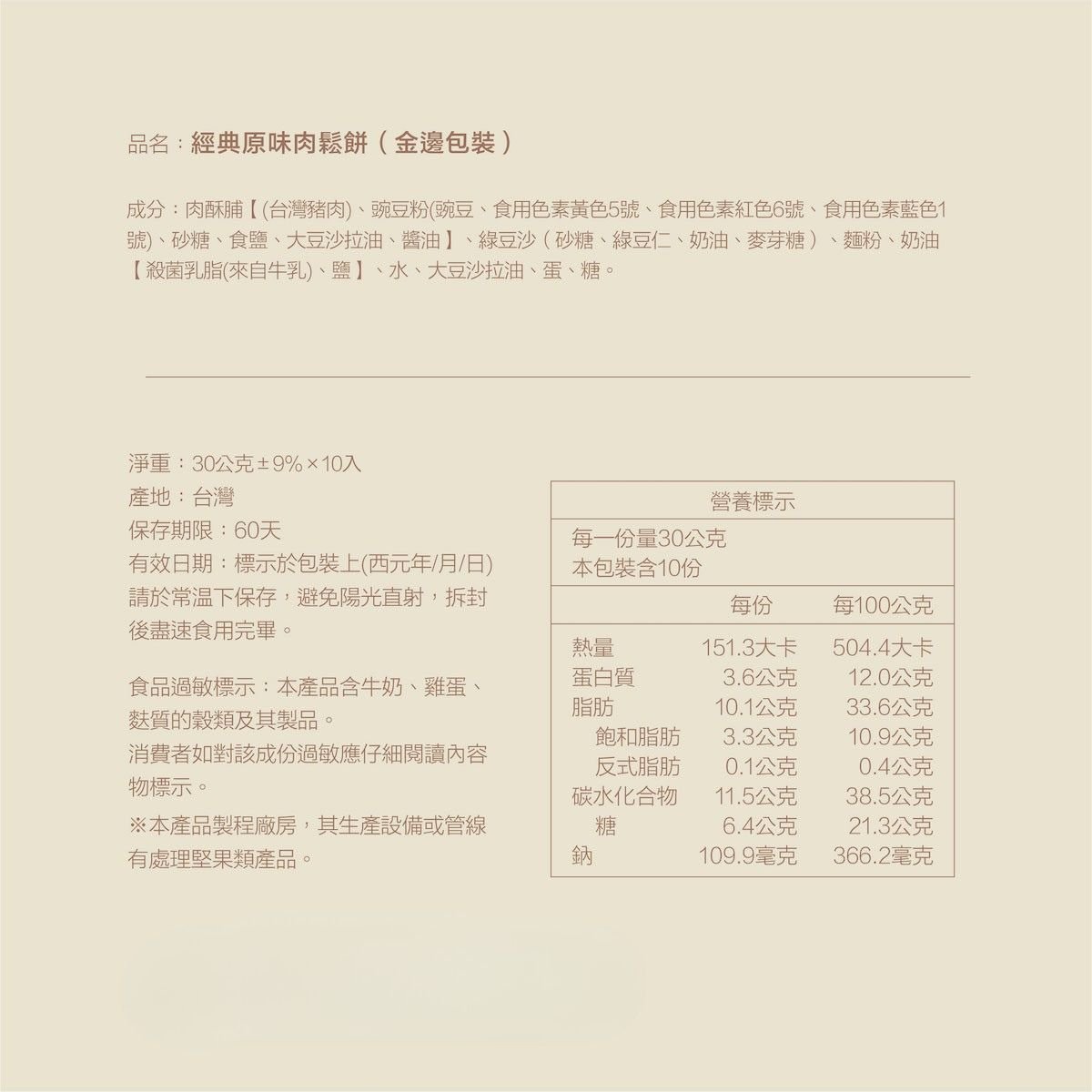 禮盒:經典原味肉鬆餅 6 顆、伯爵紅茶肉鬆餅 6 顆 送禮最體面!一次雙享人氣口味新選擇 辦公室分享、聚會拿出來更方便 小巧可愛 適合當茶點 肉鬆餅始祖/殿堂級肉鬆烘焙品牌 皮 1 比 肉鬆 9 的黃金比例 嚴選台灣豬肉鬆,無添加豆粉 每盒為12入裝,每入約30 g 禮盒尺寸:31 x 23.5 x 5.5 (cm) 重量:632(±5) g
