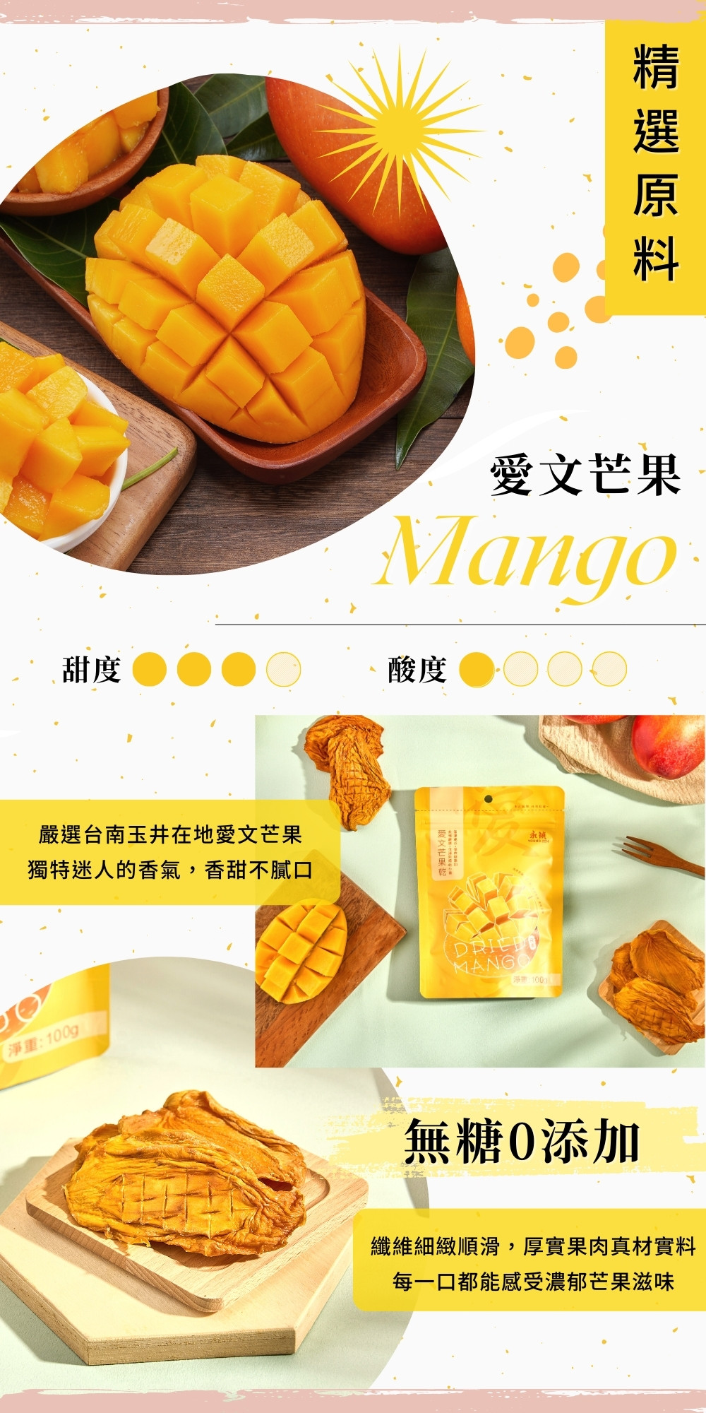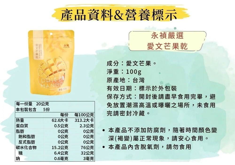 【產品特色】 - 永禎嚴選,低溫烘焙48小時 - 水果纖維及營養完整保留 - 新鮮直採,原味呈現,天然的甘、酸、甜 - 不添加人工色素,防腐劑,糖精 - 純素 【成份】愛文芒果 【廠家介紹】 2018年,「永禎」品牌成立,在台灣本地開始銷售,以天然永續為初衷,用台灣本地豐富優質的天然食材詮釋「美式健康飲食」(Natural Food),開啟了天然飲食道路的新征途。 【淨重】100g/包 *永禎果乾由天然水果製成,自然因素如季節、天氣、溫度、雨量等會影響每批水果的收成會造成差異,因此製成果乾的口感色澤外觀也會略有不同。*