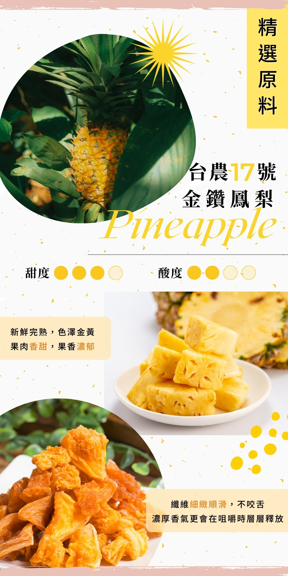【產品特色】 - 永禎嚴選,低溫烘焙48小時 - 水果纖維及營養完整保留 - 新鮮直採,原味呈現,天然的甘、酸、甜 - 不添加人工色素,防腐劑,糖精 - 純素 【成份】鳳梨 【廠家介紹】 2018年,「永禎」品牌成立,在台灣本地開始銷售,以天然永續為初衷,用台灣本地豐富優質的天然食材詮釋「美式健康飲食」(Natural Food),開啟了天然飲食道路的新征途。 【淨重】120g/包 *永禎果乾由天然水果製成,自然因素如季節、天氣、溫度、雨量等會影響每批水果的收成會造成差異,因此製成果乾的口感色澤外觀也會略有不同。*